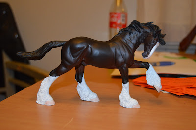 The stallion was a nice black with a strip and two white socks. I was very lucky with him. He's got a nicely masked stripe, no visible flaws (I see that he got some dust on him in these pictures but at least it's not flaws). The only thing I would've wished for would be a little neater edges on the socks. Other than that, I love him.